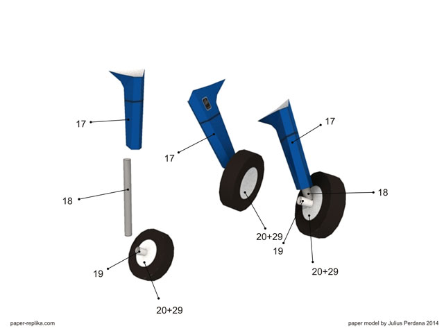 Slide part 18 inside part 17 and combine it with the wheel (20+29). Use part 19 as a connector to the wheel.