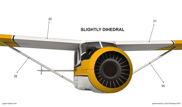 Insert the spars and glue both wings (20 and 21). Attach wing support struts (35)