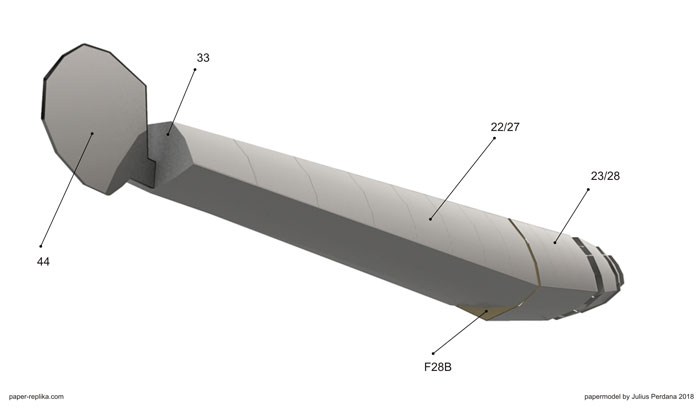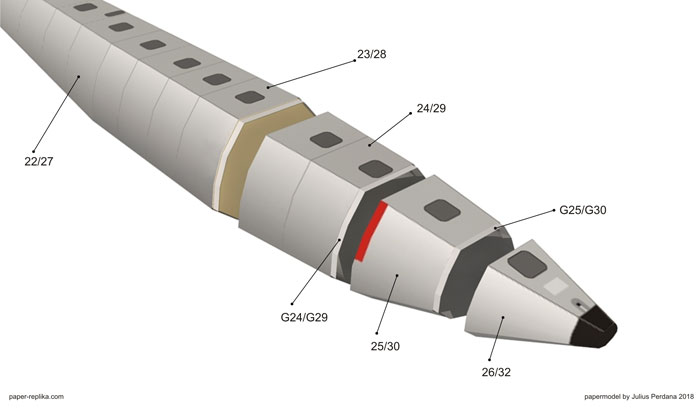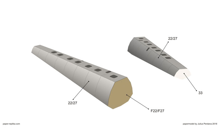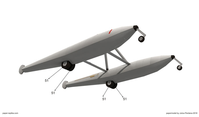 Attach all the wheels on each float so the wheels can support the float. Combine the 2 floats with both part 34. And then attach all the struts (38, 39, 40 and 41) as shown above. Positioned all the struts as the image. I use hot melt glue to cheat this step. Make sure you use the correct paper, which is 80-100 gram paper for all the struts and spinner.