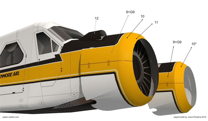 Glue part G9 onto the back of part 9. Assembly the cowl part 9,10 and 11 then glue the air intake (12). You can choose to build an easier cowl with part 9 and 10*.