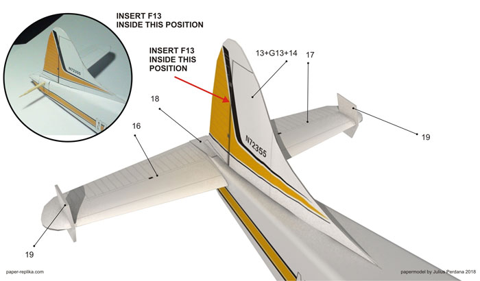 Use a toothpick on part 7 to be a spar for the horizontal stabilizers (16 and 17). When the stabs are in place cut the "black line" on each wing tip with scissors and insert part 19 on each stabs. Assembly the fin (13,G13 and 14) and then insert a former (F13) inside that fin align with the rudder hinge. Glue part 18 first before finally glue the fin on the tail section.