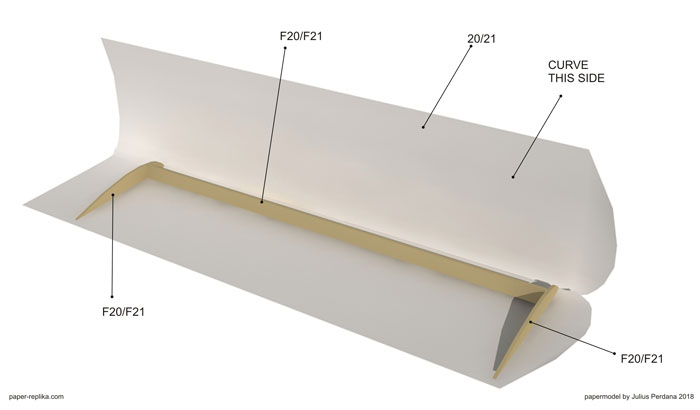 Score the fold line on the wing (20) and fold like the image above, make the top side slightly curved. Glue sets of formers (F20) inside the wing part. Close the top part and glue the wing on the trailling edge.