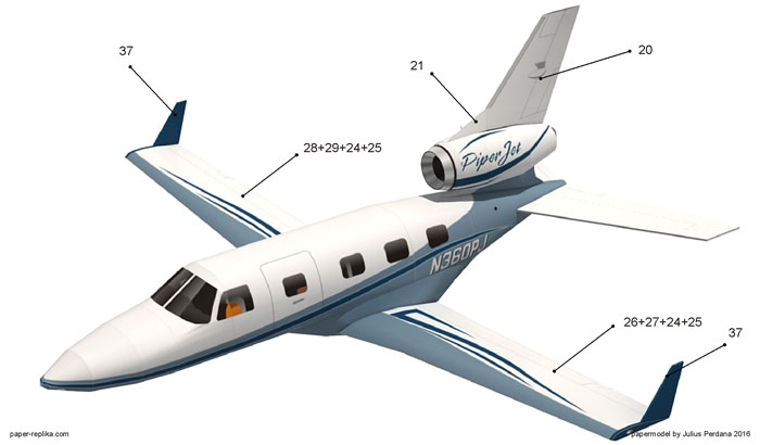Usually I build the RC plane first and then later I release the papermodel version of it, but often I became lazy and it never happened. So this time I made the paper version first. This model is a single engine very small corporate jet from Piper Aircraft Inc, a PiperJet. I found this plane very beautiful and I want to make an RC plane of it. I love their Cherokee, I already made an RC of it and it flew so good very easy to handle. Sadly this Piper PA-47 PiperJet never went into production, the project ended after they made a prototype and first flew on 2008. They even redesigned the PiperJet and then came PiperJet Altaire, but once again they cancel it due to economic conditions on 2011. I made this papermodel in 1/33 scale, the model will have 40 cm or 16 inches wingspan.