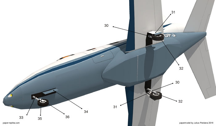 Assembly the plane's belly first before wrap it around on the bottom of the fuselage. It is important to glue inside part 11 and the rest if belly part that contacted with onto the cardboard structures, and make it rigid.