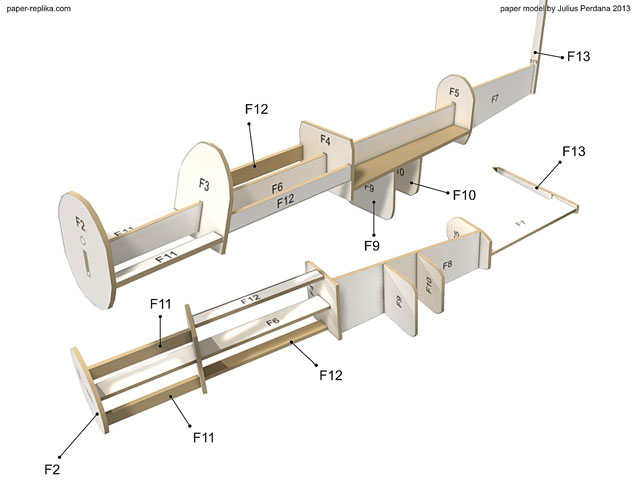 Use 1.5 mm thick cardboard for the formers or plane skeleton. Assembly fuselage former parts just like image above. You may want to use CA glue (Cyanoacrylate) to save time. It was quite hard to cut 1.5 mm cardboard with knife, so you may also use big scissors to cut them out. Make sure all formers are aligned in straight line, other wise your model could become twisted. You can use toothpick to become a shaft for the propeller if you'd like, for that you have to cut the round hole on part F2.