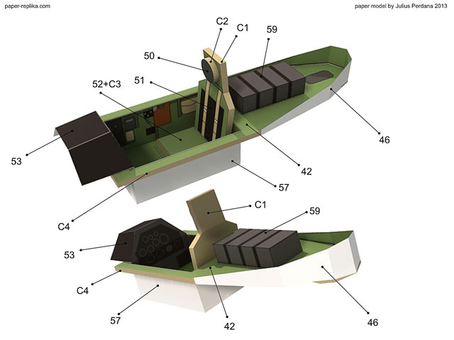Assembly the cockpit set starts with part 42 and C4, and then attach part 57 (cockpit cavity). Glue part 46 on place and other parts.