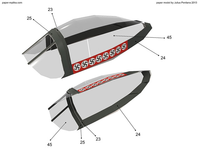 Use celluloid (transparent plastic sheet) for part 45. Glue part 45 to part 24 first to get the bubble shape. And then pun the rest parts. Also put parts on the inside the cockpit glass.