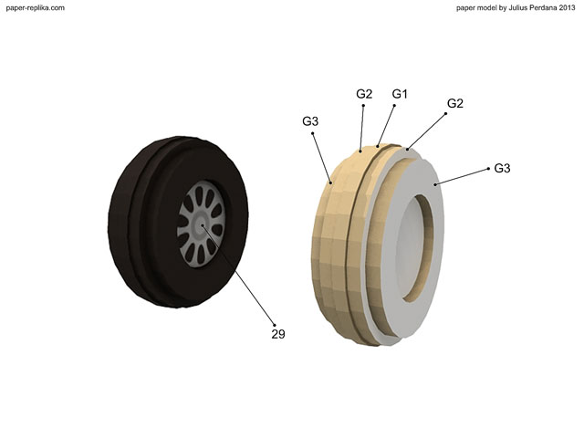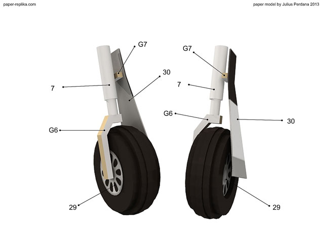 Combine G1, 2 G2s and 2 G3s to become main landing gear base. Paint it with acrtylic paint or you can use black marker.