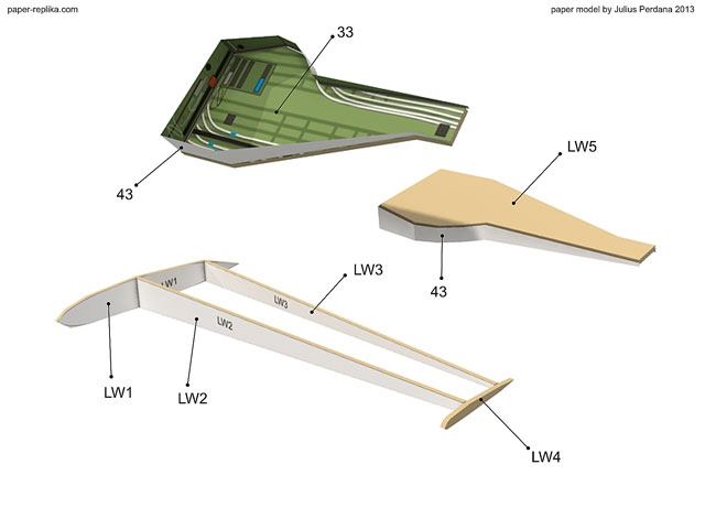 Assembly the left wing former (LW1, LW2, LW3 and LW4) before wrapping it around with main wing skin part. Assembly the landing gear well by glueing part 33 with LW5 and then glue part 43 around the edge.