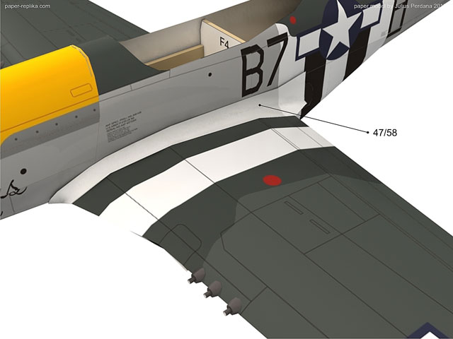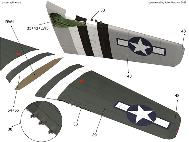 Attach the landing gear well part on part 40 first before close the wing part with part 39. Glue the wing-tip on to its place (part 48). Do the same on the opposite wing. Complete the wing part by attaching 3 .50 cal machine gun muzzles in place (part 38) on each wing.