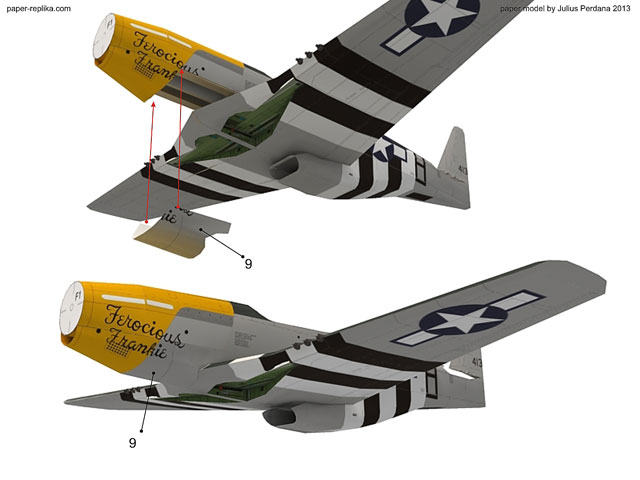 Attach main wing below the fuselage with CA glue then lock it with part 9.