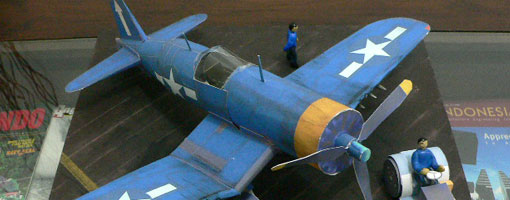 Another diorama model from Rizky Ferriansyah, this time is a plane from my favorite childhood tv serial "Baa Baa Black Sheep". It's F4U-1D Corsair complete with moto tug which all adopted 1/35 scale. The Chance Vought F4U Corsair was a carrier-capable fighter aircraft that saw service primarily in World War II and the Korean War. Goodyear-built Corsairs were designated FG and Brewster-built aircraft F3A. The Corsair served in smaller air forces until the 1960s, following the longest production run of any piston-engined fighter in U.S. history (1942–1952). Some Japanese pilots regarded it as the most formidable American fighter of World War II. The U.S. Navy counted an 11:1 kill ratio with the F4U Corsair. [Wikipedia]