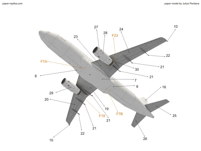 This paper model kit use inner glue tabs, part numbers that are colored in orange are inner glue tabs. Parts 17 and 18 each comes with 2 identical parts, combine them first before attaching to the bottom fuselage. parts 17 and 18 they should have glue tabs, the image above is 3d rendered and the glue tabs are not visible, the real one have it.