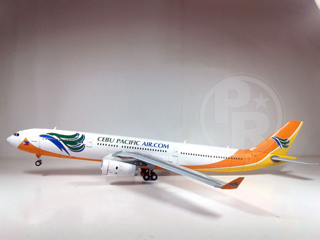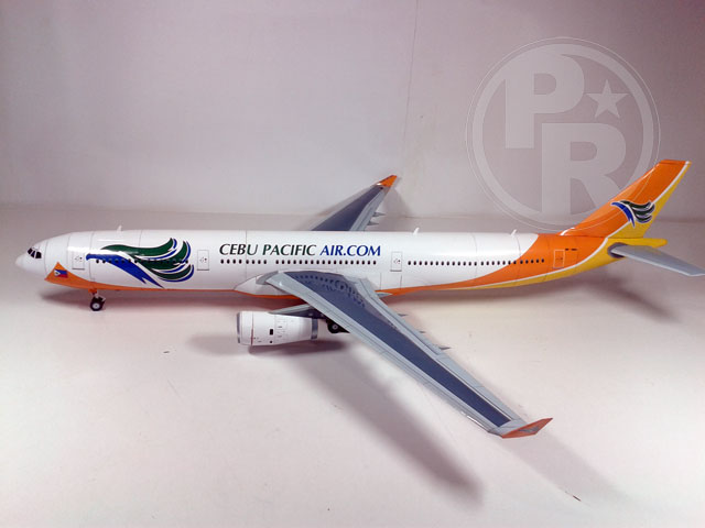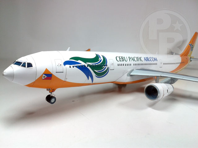 First I would like to condole our friends who become victims of Typhoon Haiyan in the Philippines. It is very sad to see the number of victims and almost half were children. Hope for the best for them and the family. This model was submitted by our friend Miguel Quilab from Philippines. He changed the pattern of Paper Replika's Airbus A330-200 to become A330-343X by adding fuselage length a bit longer than the original. Miguel uses Philippines Cebu Pacific Air livery, its color is beautiful. He also made landing gears patterns and provide a template in 1:100 scale.