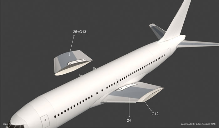 Combine the left engine parts, glue the glue-tab (G14) on the inside of part 31 and then attach with part 32 and part 33. Combine part 26 and 35 and then insert it inside part 33. Close the engine nacelle with part 34. Finish it with part 37 and 38. Make sure all seams are on the bottom and align them with the engine nacelle's seam.