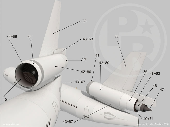 A new line for airliner category has been added, it is a McDonnell Douglas MD-11 model. It was designed and built based on DC-10 with three engines configuration, and was manufactured by McDonnell Douglas and continued by Boeing. I choose a KLM livery for the first papermodel release because KLM was the last airlines that ever used MD-11 as a passenger planes. All passenger MD-11 now already grounded, the last one was PH-KCE and also named as "Audrey Hepburn".You can see the name Audrey written just below the cockpit window. PH-KCE last flight was on November 11, 2014 after 21 years in service. The papercraft template consist of 10 pages, when it built it will have 51 cm or 19.7 inches length wingspan. The scale is 1:100.
