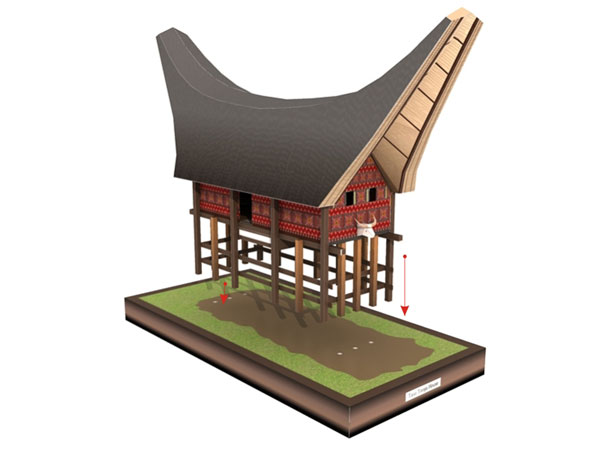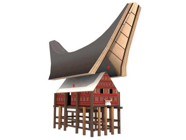 Tongkonan is a traditional house traditional Toraja community. The roof has a boat like shape, comprising the composition of bamboo (to date partially tongkonan receipts the tin roof). At the front there is a row of water buffalo horn. The inside of the room used as a bed and kitchen. Even tongkonan used also as a tomb. Tongkonan derived from the word tongkon (meaning sit together). Tongkonan divided based on the level or role in society (social hirarchy in Toraja). In front the tongkonan is granary, called 'alang'. Poles barns are made from palm tree trunks (bangah) is currently partly already use concrete, In front of the barn there are various carvings, among others, illustrated chicken and sun, a symbol for the complete case.