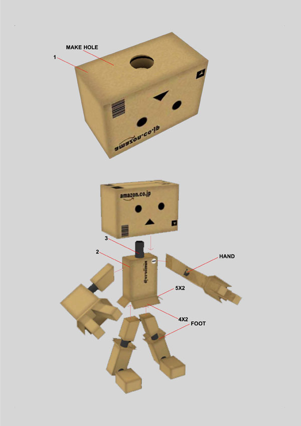 This Revoltech Danboard action figure converted into paper model form by Rizky Ferriansyah. In the popular "Yotsuba&!" manga, Danboard (from the Japanese word "danboru," which means "cardboard") is a robot costume made of cardboard. Danboard is a costume worn by Miura Hayasaka, a friend of Yotsuba's most frequent playmate, Ena Ayase. Ena does not have the heart to tell Yotsuba that Danboard is not a real robot, so Yotsuba thinks Danboard is real.