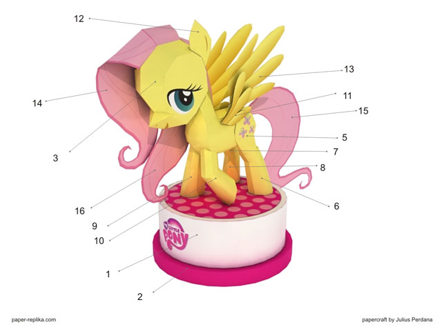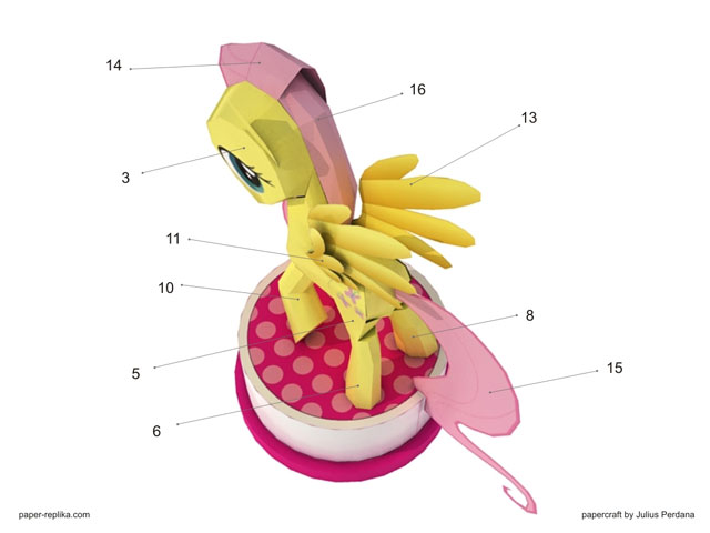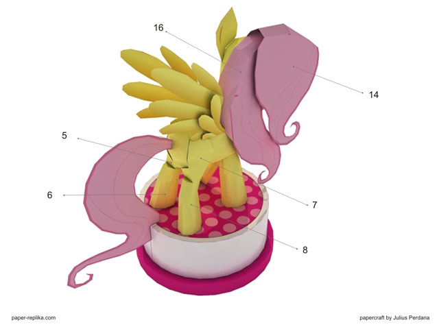 This is the second template of My Little Pony series papercraft kit, Fluttershy. In this template I made a few adjustment on its 3d model, so it is smoother then the Rainbow Dash. I also plan to replace Rainbow Dash with the new shape when I have time :D. There's a bit curvy on her hair, that you must bend it and will fall to right of her head. Please give me feedback with the new 3d shape and templates compare to the Rainbow Dash template. Which one do you prefer?, your inputs will be use to make the next ponies.