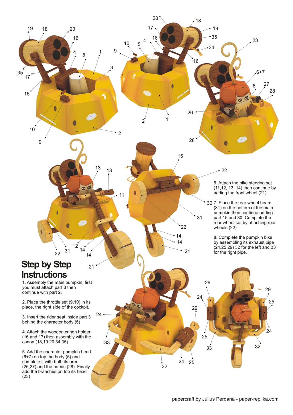 This guy who is riding a pumpkin trike is a Morcs, once a thriving clan that specialized in hunting and farming, the number of Morcs has been heavily decimated by Noctus’ forces. The remaining Morcs serve as guards of the great refuge and scouts for the resistance. They are mainly characterized by their practical and down-to-earth attitude. The story is from a graphical novel project RIA - The Lightclan Chronicles created by Thorsten Kiecker. This paper craft is a commissioned project from STENARTS more than a year ago for a comic exhibition in Germany, now we make this paper craft template available for free. There is another model and it will be release for free too.