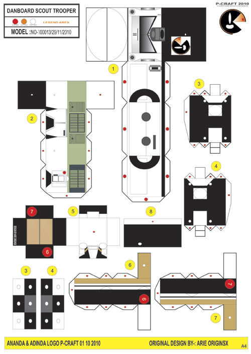 This pattern was submitted by Arie Originz. He made his own creation of Star Wars scout trooper style Danboard / Danbo. He numbered this template, 13. It kooks like he already made a bunch of paper crafts using this "danboard" like figure. Danboard or Danbo is a very popular character among anime and manga enthusiasts. Although the figure shape only boxes with minimalistic face, it like it contains a live in it. Arie also made this paper craft articulated. The pattern is in JPG in RAR file.