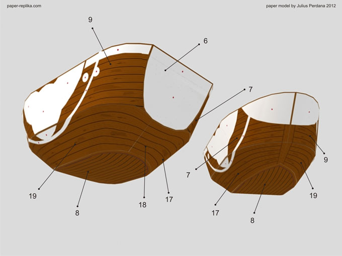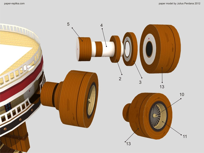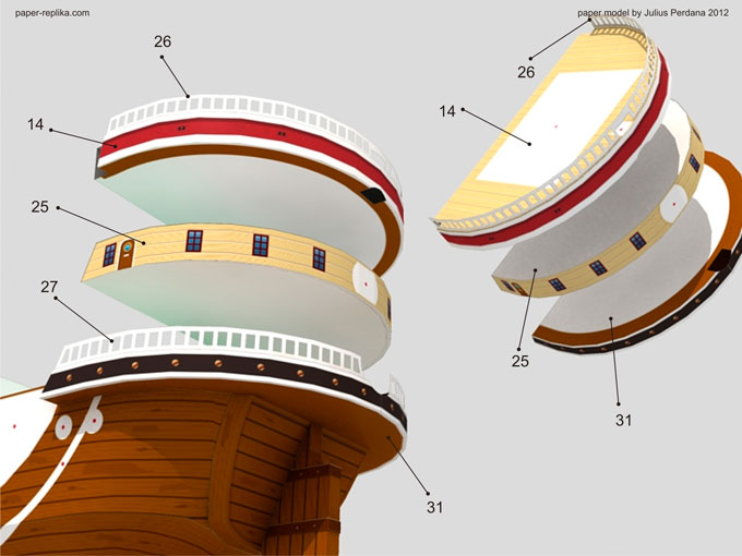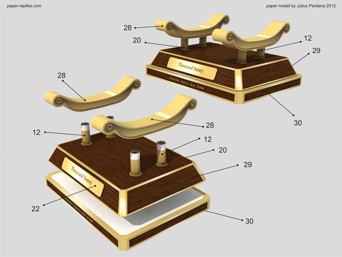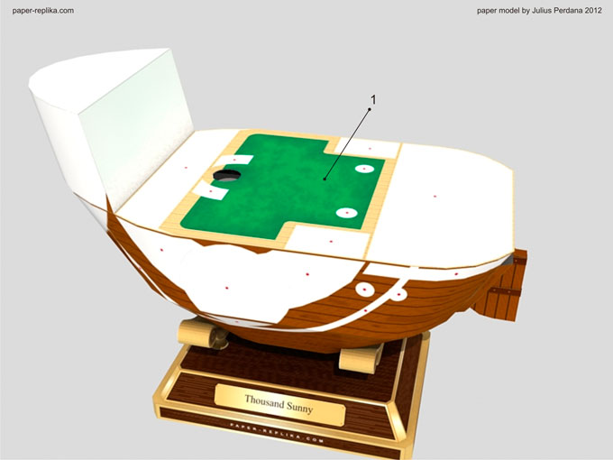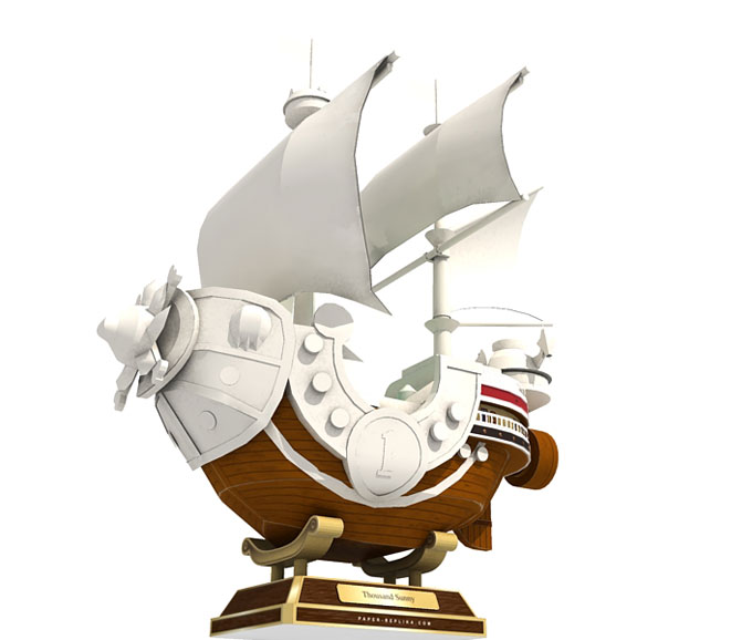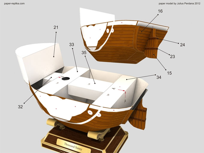 Due to the large demand for the model of the Thousand Sunny then finally I made it. As the Going Merry, this Thousand Sunny paper model will be divided into 3 parts. This model is slightly larger than the Going Merry with different scales. Because if I use the same scale as the Going Merry, the Thousand Sunny will be very large in size. Which will result in a lot of parts that would be difficult to put in A4 size paper. This ship model is still using construction frames inside the hull. I hope I can finish all parts in 2012, but I doubt it because less than a week from now it will be Christmas. Merry Christmas everyone, happy holiday and may the force always be with us all , cheers.