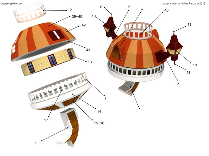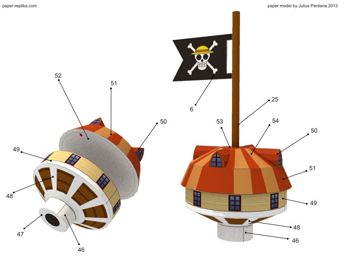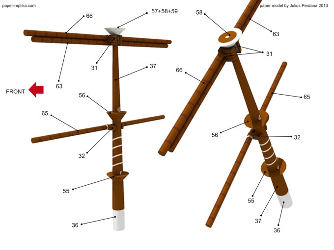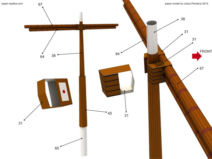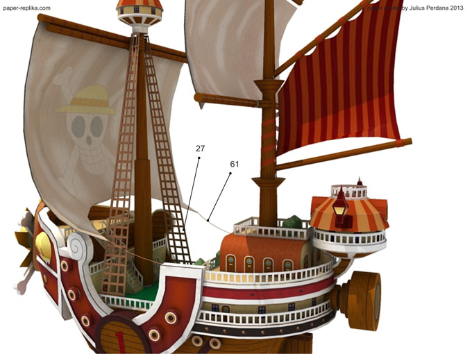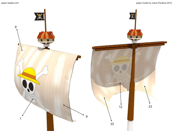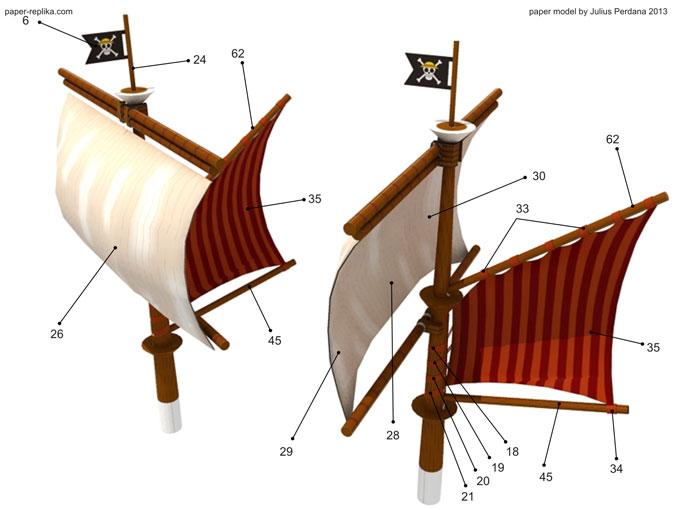 The final part is ready, part 3 of 3. This part contains 10 pages of patterns, the parts are simpler compare to Going Merry in the same section. Assembled model has 58 cm in height, 47 cm length and 30 cm width. These model parts use a lot of cylinder or tube shapes, so you have to choose the correct paper weight, I recommend to use 120 gram. All three sails are double sided and you can replace flag beams with toothpicks.
