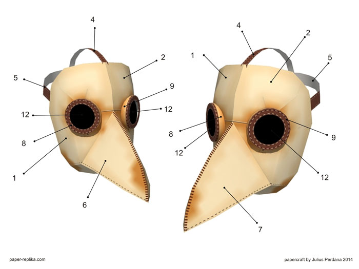The first time I post the photo of this mask template design process, my friend thought I made a mask of one of the characters in the game Assassin's Creed. Actually I inspired by the Ebola outbreak that happened in some countries around the world. At the time of the bubonic plague known as the Black Death in the 14th century, doctor who care for patients wearing a special mask that like a bird head. They do not know about Hazmat suit yet and didn't have any knowledge of bacteria, let alone viruses. The doctor fills the inner beak part of the mask with sweet scent of flowers so they do not smell the stench of disease they are handled. Halloween is also soon to arrive, this mask is also suitable to be used as part of a costume. This papercraft template is 1:1 scale and it wearable. I also share the PDO file, so you can edit its size.