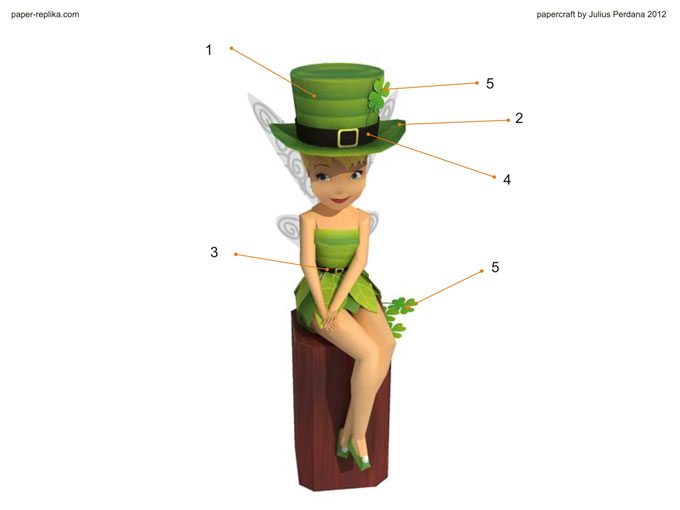 The plan was to make a quick paper craft for St. Patrick’s day 2012. So I make an add-on or an accessory part for this pretty forest fairy “Tinker Bell”. She will wear Leprechaun theme green tall hat, waist belt and four-leaf clovers. The template only has a single sheet, you have to download the fairy separately. Actually I’m still confuse about the leaves, which one is the right one for representing St. Patrick’s Day? So I make both available on the templates XD. You have to remove her hair bun first so the hat will fit to her head.