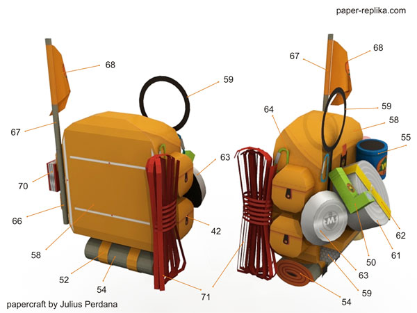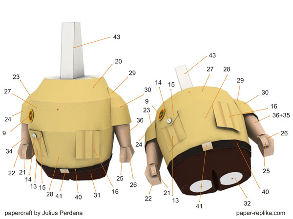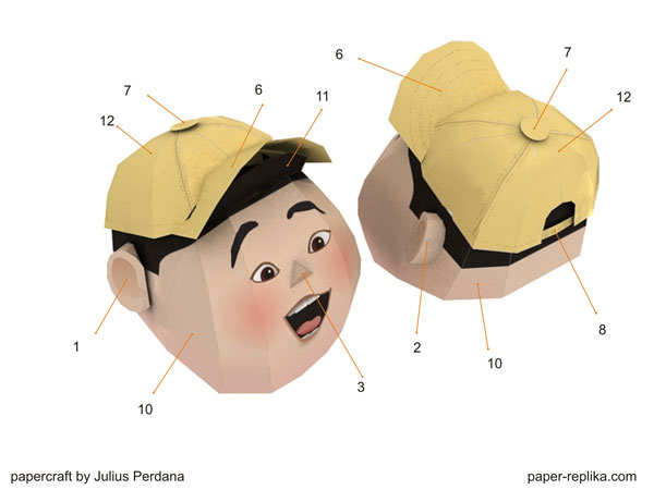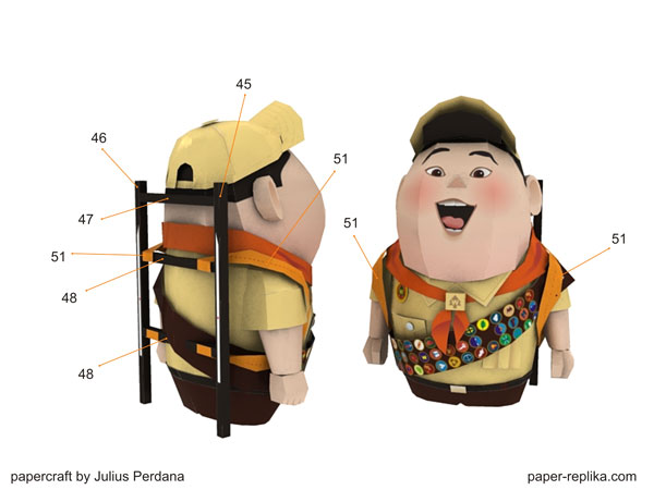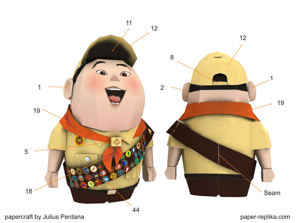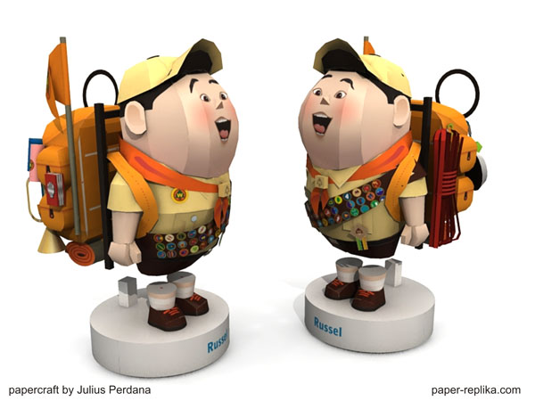 Almost 2 weeks since the last time I update my site, I got cold and headache so I have to stop staring my computer monitor for a while. I have a new papercraft for you, it is Russell model from The Disney UP movie. I like him very much, cute and loveable. This papercraft will stand almost 16 cm without its display stage. The template contains 7 pages of A4 / letter compatible. I have to simplified most of the small parts but still in paper-replika.com detail level.