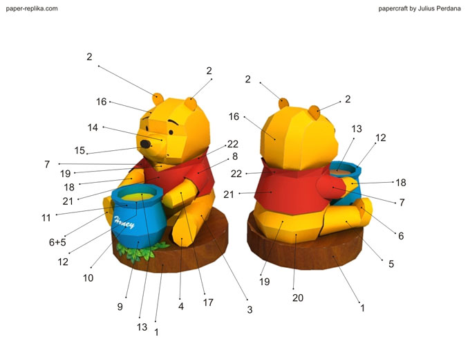 This Pooh Bear paper craft I believe would be the last model release in this October. Actually I missed one model from cartoon category this month, it is Smurfette paper craft and I will make it on November. I haven't found Winnie the Pooh paper craft template yet around on the internet so I decided to make it one. The template only has 2 pages. In this template I try new glue tabs, this is the result of your answers on my question about glue tabs at Paper Replika Facebook page and Twitter.