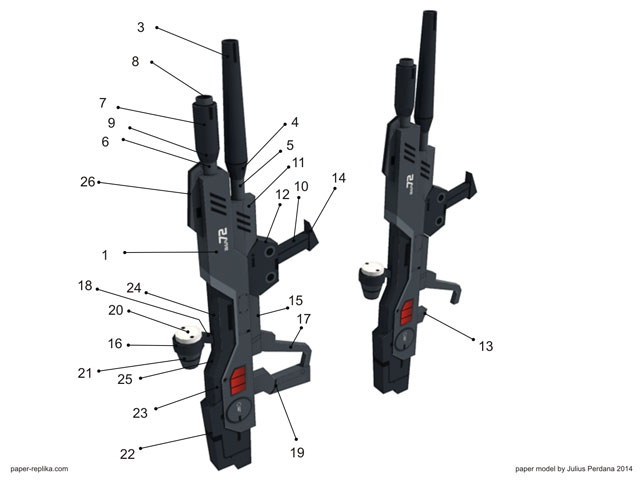Rifle on the left is stand alone version, when you want the Impulse to hold in his hand you need to replace the handle grip number 19 with number 13 as seen on the rifle on the right.
