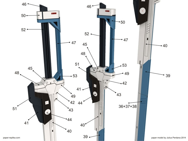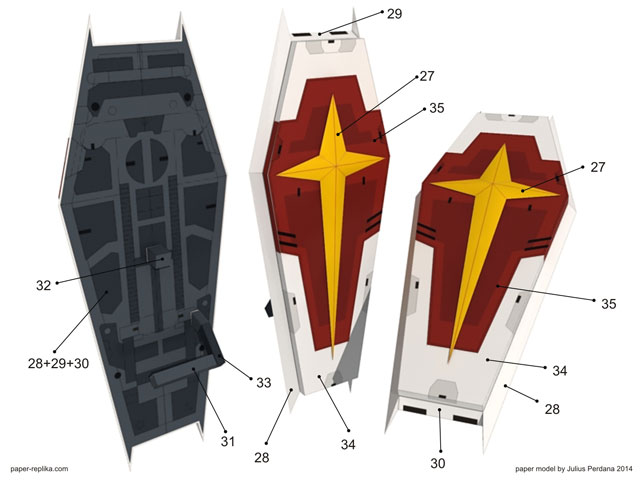 This is the last of 5 parts, with this weapon kit the Gundam is complete. The weapons are not as complicated as they are seen. I have simplify many parts for easier and stress-free build. All parts are designed to be static display model as seen on the presentation image below. If you want the Impulse to hold a sword, you have to modify it yourself. The template contains 13 pages of patterns for build a rifle, a shield, two swords, a boomerang and a booster backpack. Next big poject is continuing Jaeger Striker Eureka model, also Cristiano and Suraj will still continue their Iron man Gemini and Gypsy Danger Jaeger model.