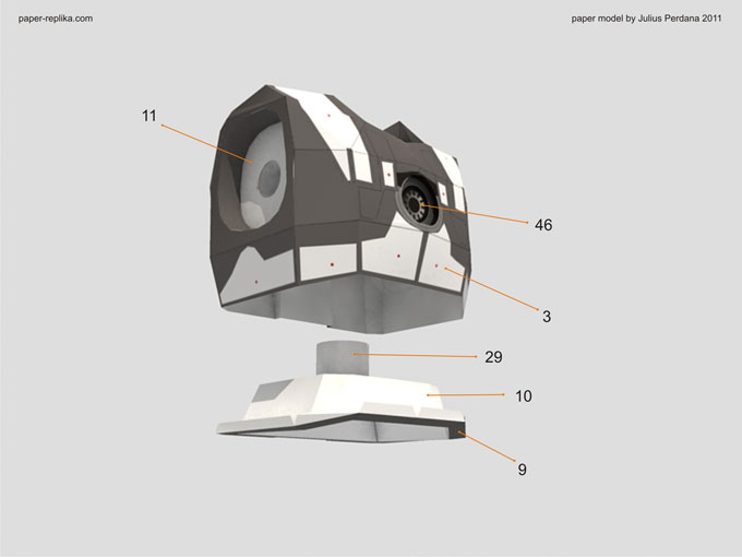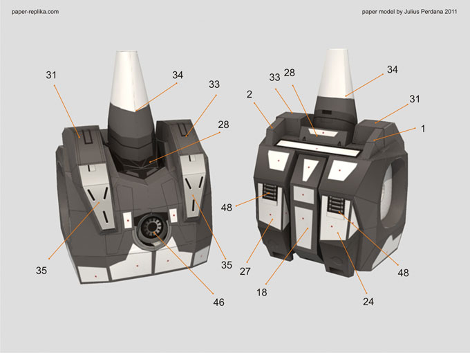 Assembly the main torso part (3), attach part 9,10,29 in the last. Reinforce part 10 with 1 mm card board (51). Reinforce part 11 and 13 with also 1 mm carboard (50). Do the same with part 29 as part 15, and make it stiff.