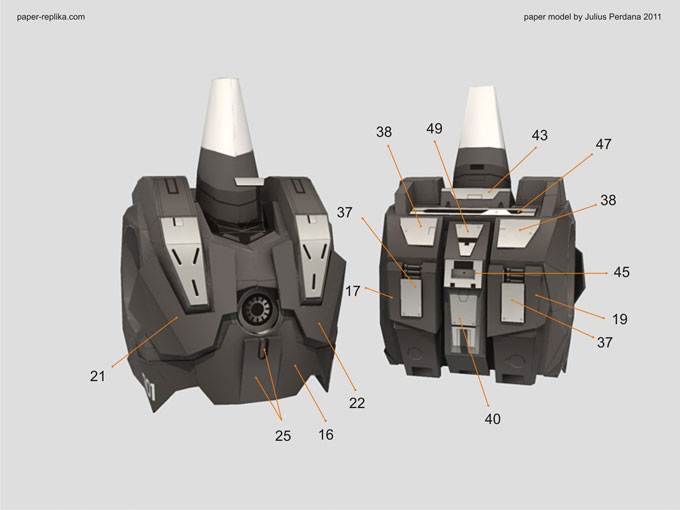 Attach part 42 first before attaching part 23. You can choose the visor color, red or black. Double part 7 and 8 to add thickness.