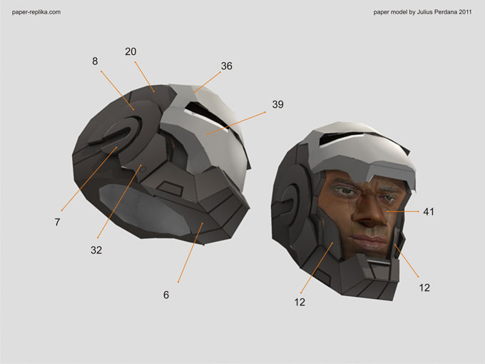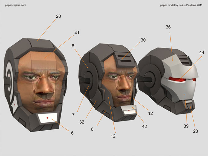 It began when my highschool friend asked me how to buy or make a clone trooper Commander Deviss armor. Then I began to search Deviss images on Google and stumbled upon on Iron Man War Machine action figure. I thought both are awesome if I can manage to make them into paper model, but still I can't do it both in the same time. To decide which one is first I made a poll on Paper Replika Facebook page and the responds were majority voted for War Machine. Inspired by Korean Gundam paper model designers that mostly are using colored paper for their build, I also made this War Machine paper model with blank templates, so that they can be printed in dark grey and silver metallic colored paper. The modeling process is a bit longer from usual because I decided to make this 1/6 scale (12 inch - 31 cm) action figure to be pose-able. It's too long so I thought it better be quite detailed and I add a face inside the mask. I plan to release it in 4 parts, first in this release : torso and head, second : gun and arms, third : waist and hip and the last are leg parts. The face can be customized with your own face, this is how to do it.