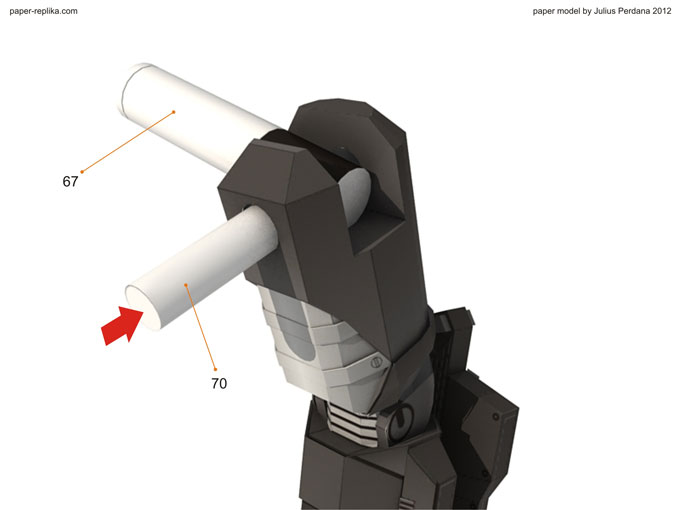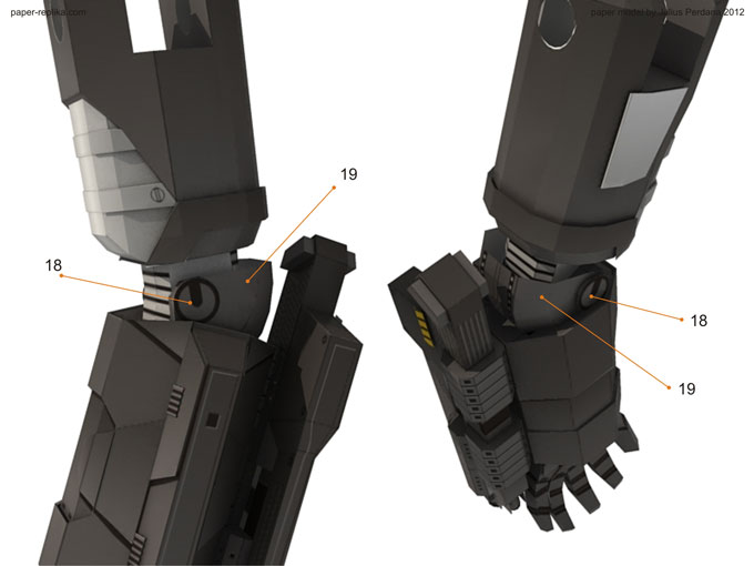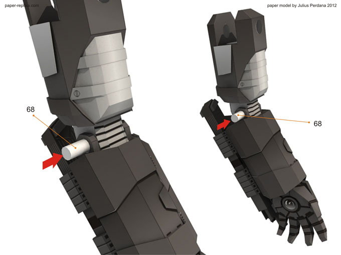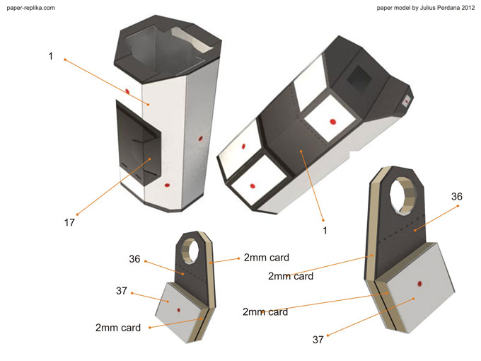 By using 2 mm thick card board layer part 36 with it then attach part 37 also with 2 mm cardboard on top part 36. We need 4 of this part, 2 pairs left and right for both arms. If you can't find 2mm cardboard you can use 2 layer of 1mm then stack them up ro achieve 2 mm thick. Don't forget to attach part 17 in its place on top of part 1.