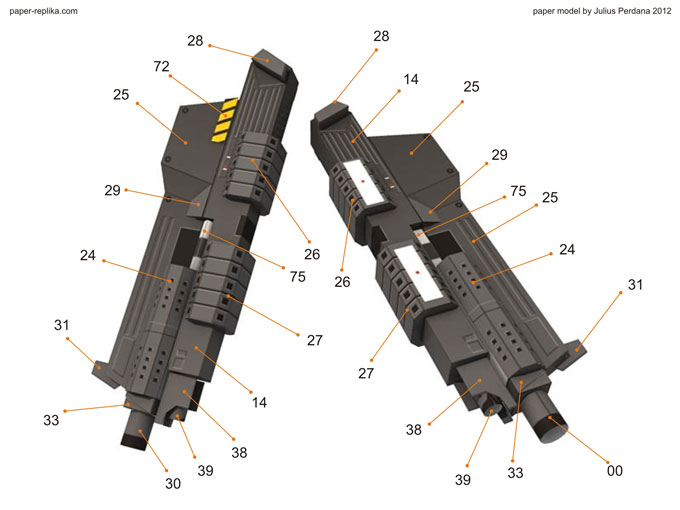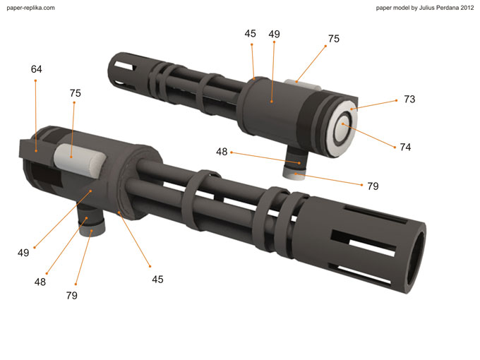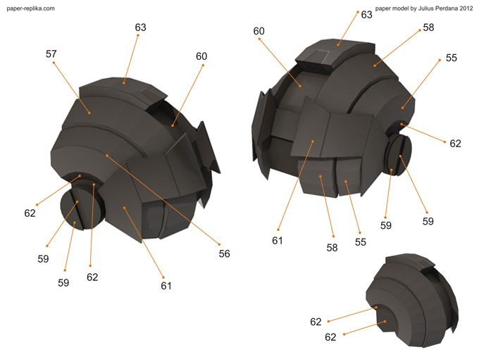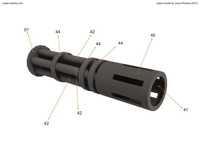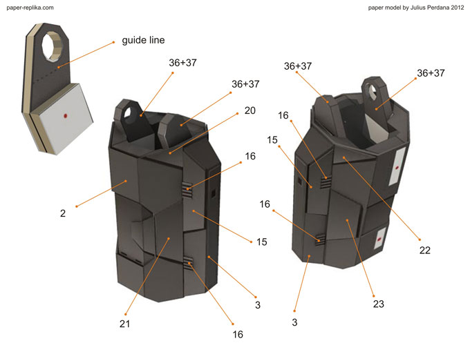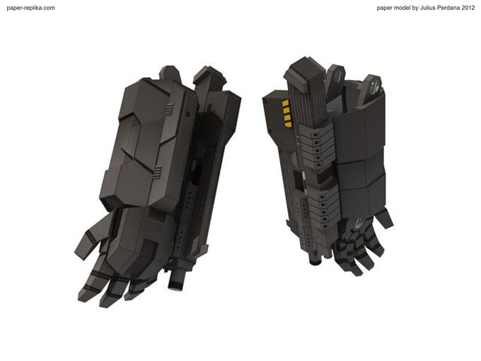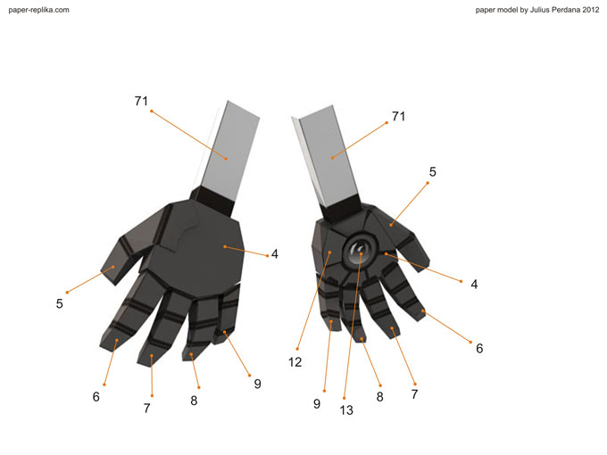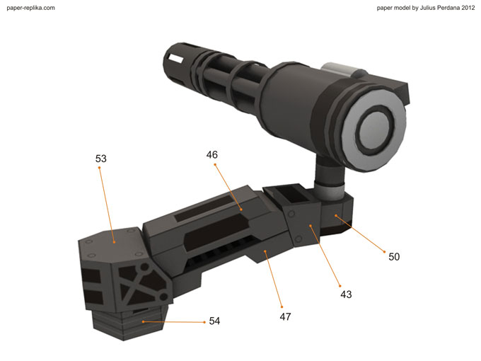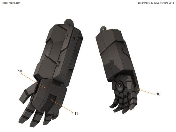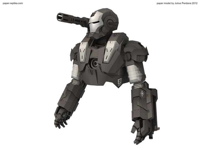 Finally arm and gatling gun for Iron Man War Machine (WM) is ready after more than a month without any update. It because I was preparing for PERI exhibition on the latest Toys and Comic Fair 2012 in Jakarta, for almost two weeks I didn’t making any template and last week I had a system failure on my PC resulting to re-format my Hard drive, that was also delay this WM progress. As usual I release in two template version, colored with 4 pages and blank one with 5 pages. In 1/6 scale the parts are very small but still can be build. In the last minute before finishing the template I re-examine all pages and found out there were some glue tabs/ flaps that were too small and I have them removed, and some parts have to be simplified because of the size of them, that alone took hours to be repaired. You have top follow all instructions step by step in order, because there are key steps which crucial to be taken in attention.