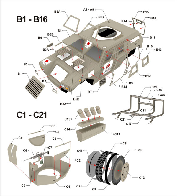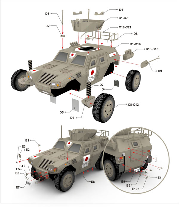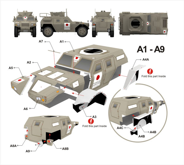 It was a commercial paper model from my old site, julescrafter.com and now I share it for free. This light armored vehicle was my first design of wheeled vehicle. It comes with 1/28 scale. The Komatsu LAV was developed in 1997 to meet a JGSDF need for an armored wheeled vehicle that could provide armored protection since their Toyota High Mobility Vehicles and Mitsubishi Type 73 Light Trucks were not adequate to provide protection from small arms fire. It had made its first appearance in Kuwait when JGSDF units had deployed the Komatsu LAV prior to humanitarian operations in Samawa.