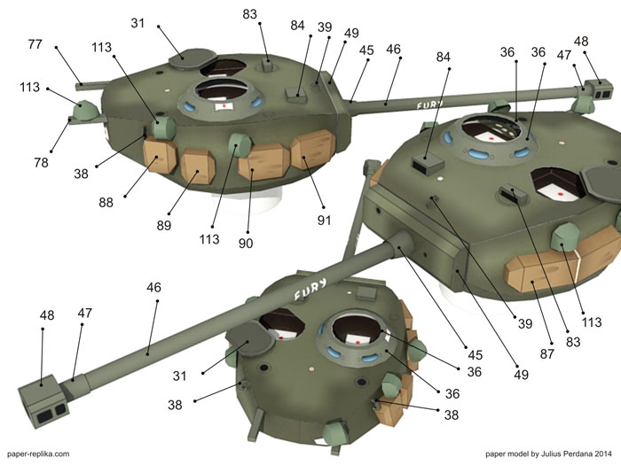 OK, back to the Sherman paper model. In Fury movie, the Sherman that use is M4A3E8 type, or usually called as Easy Eight. This Sherman is different from the other Sherman, bigger tracks, bigger gun. Actually this model tank can be finished last week. But after the model is finished, it felt a bit bland, because something is missing. This tank needs the crew, in order to truly represent the Fury movie. You can build this Sherman with or without the crew. The scale is 1:30.