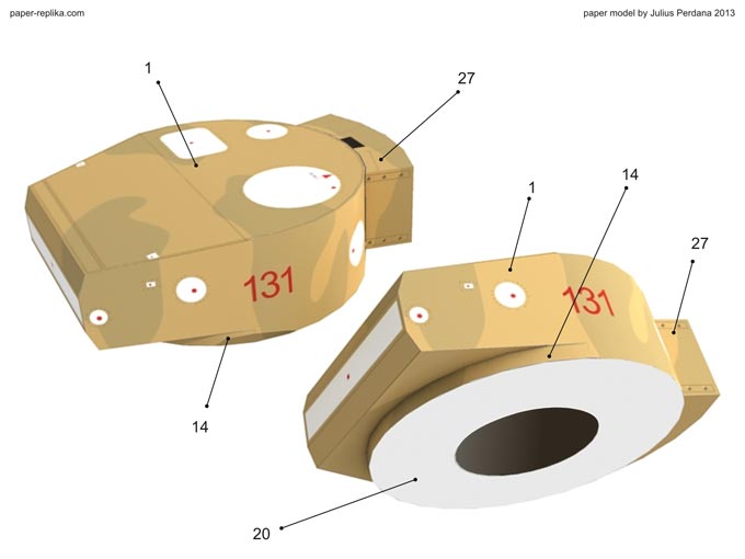 Assembly turret base (part 1,14 and 20) then combine it with turret compartment (part 27).