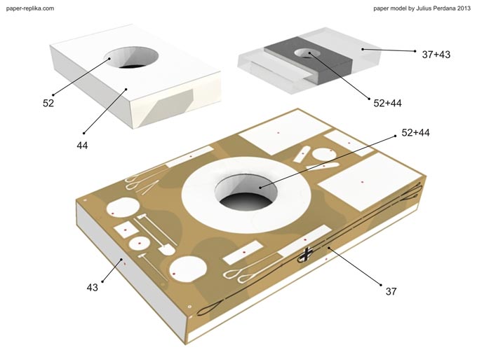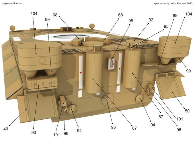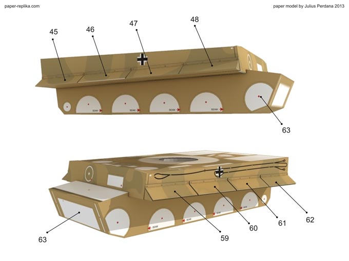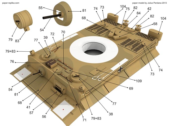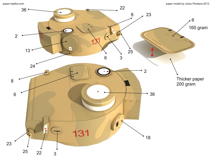 Add more turret details on top and both sides of it. Watch for (!) symbol, it means layer the part connected with it with thicker paper. When placing part 36 on top of the turret, make sure you align the seam.