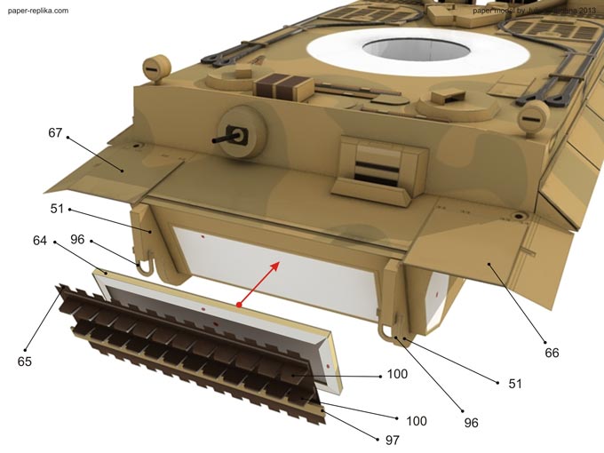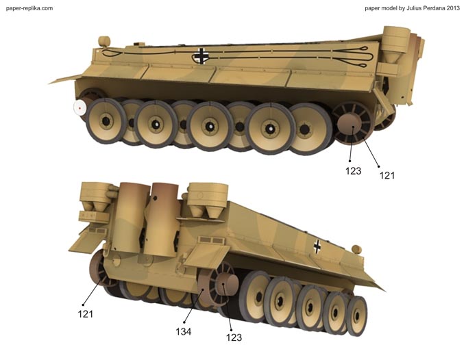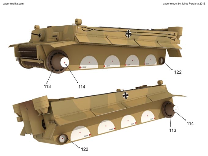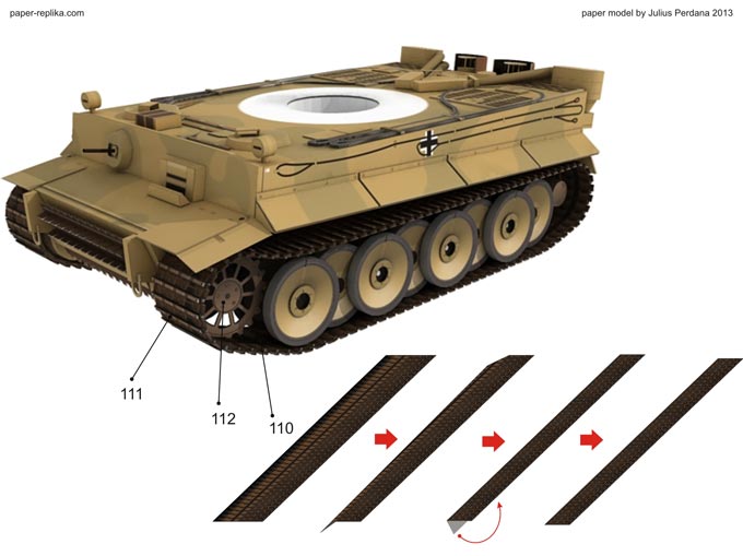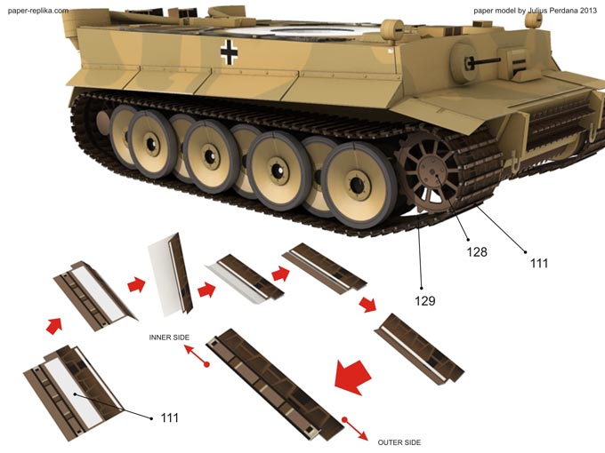 Fold the detailed track part according image above (part 111). Part 111 for left and right track set are different (mirrored). Paint the white edges with black to have better result on the model.