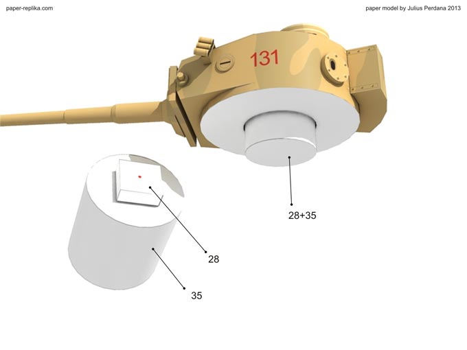 Glue part 28 and 35 and then glue it to the turret from inside. This part will be the rotation axle of the turret.
