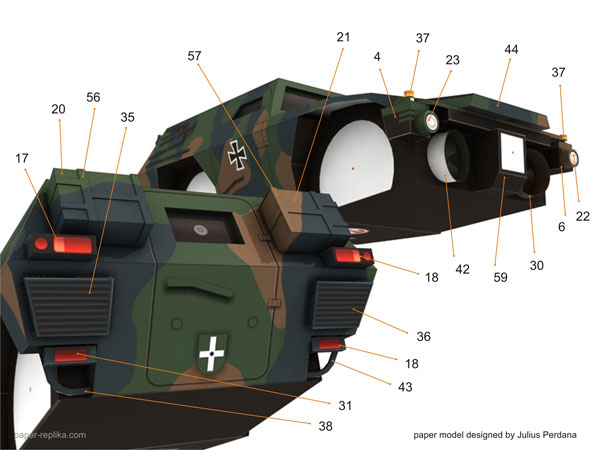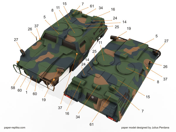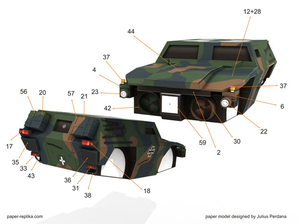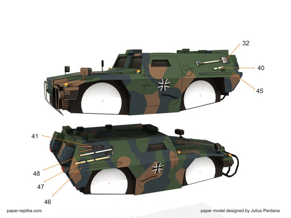 I have been preparing for this model since long, but only in the form of 3d models. Because of the limitations and the lack of reference blueprint images then makes this model less accurate. I only use a few photos to make this model. Based on the vehicle length obtained from the specification data, I made this model in 1 / 35 scale. The Zobel is produced by German military vehicle manufacturer GST (Gesellschaft fur Systemtechnik mbH) for light reconnaissance vehicles. Four-wheel suspension can be raised so that the vehicle body can be lifted upward to drive in off road terrain. The Zobel has not been actively used, it is still a prototype. File opening password : paper-replika.com