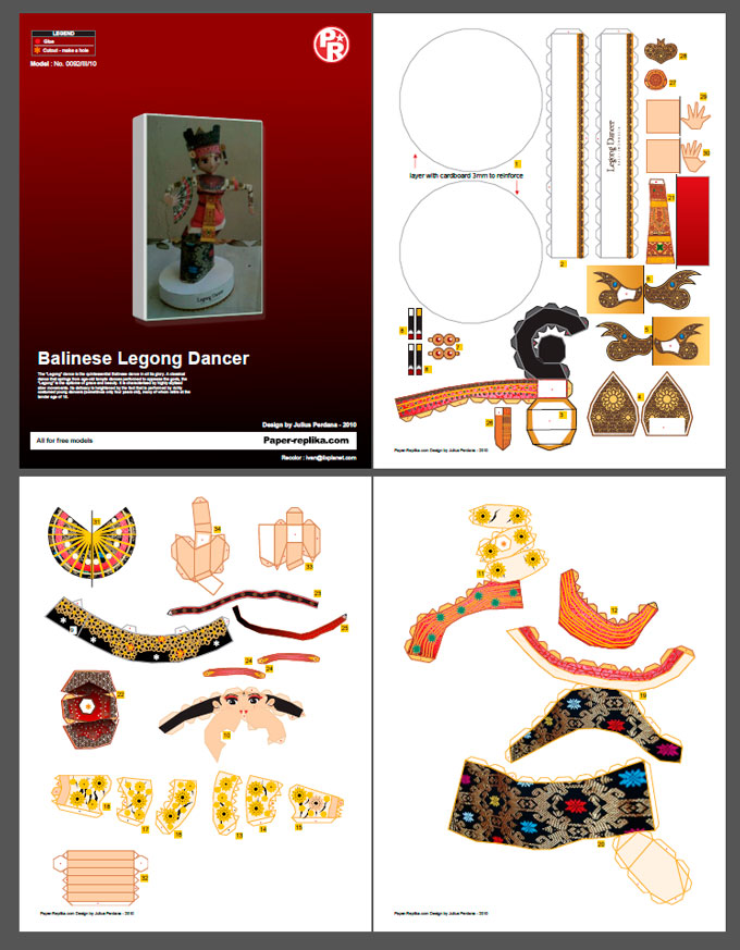 This dancer template was submitted by Ivan vh, he recolor the original Balinese Legong dancer template with his own texture. Although he uses different pattern / batik from different part of the archipelago but it still looks beautiful and different from the original one. Built paper craft in the photo was assembled by himself. The PDF file is quite big in size (almost 6 MB) so I split it into 3 parts.