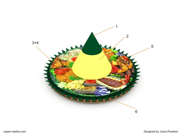 This papercraft is very simple, only 1 page of paper. Tumpeng Rice or Nasi Tumpeng is very common in Java though Bali culture, it's a cone shaped yellow rice dish. The cone shaped rice erected on tampah (rounded woven bamboo container) covered with banana leaf, and surrounded by assorted of Indonesian dishes. People in Java, Bali and Madura usually make Nasi Tumpeng to celebrate important event or a gratefulness symbol.