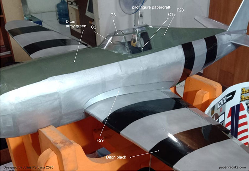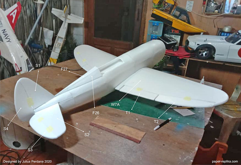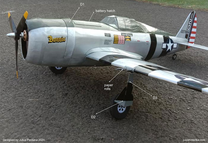 About 2 months ago I made a poll about what the next radio control plane model on my Youtube Channel Community tab. The winner is the P-47 Thunderbolt 'Razorback' version. I made the model in Blender 3D, you can see the process of 3D modelling in this video. The reason I made 1200mm wingspan is to match my P-51 Mustang scale, both have 1/10 scale. It equipped with servoless retractable landing gear. I have a problem locking the landing gear strut, I just use CA glue so it don't have enough strength. I also made the plans for fixed landing gear. At first I use the wrong CG which is 7,7 cm, the correct CG after some trial is exactly 7 cm from leading edge of the wing root. The can fly straight with the correct CG but needs more power, I recommend to use 4S for maximum performance, but you can still fly with 3S for scale flying. I haven't fly any RC model on the last months so I was a bit clumsy in landing and take off.