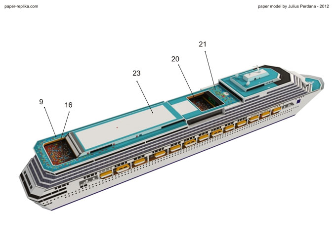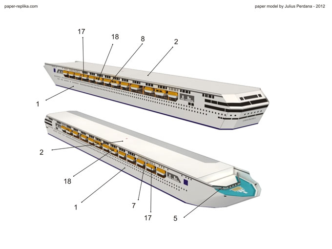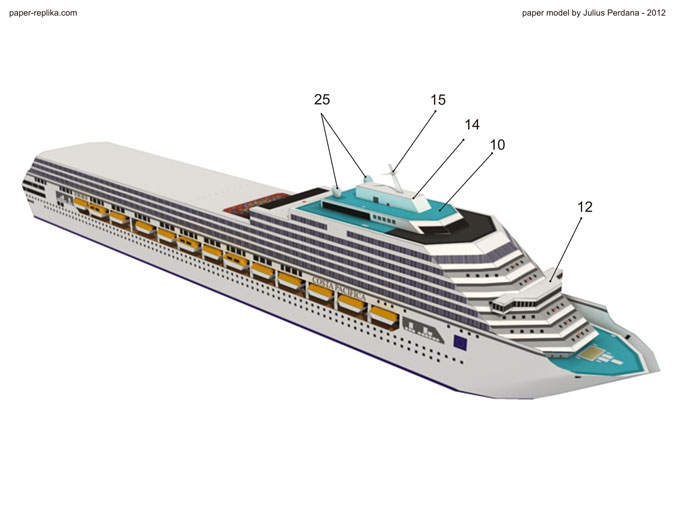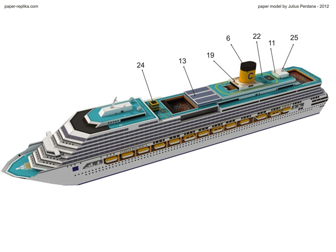This is Costa Pacifica model, one of 4 luxurious Concordia class cruise ships owned by Italian operator Costa Cociere. They are 4 sister ships, Concordia, Pacifica, Serena and Favolosa. This paper model is very simple and has only a couple of page to print. I use 1:1200 scale for this 24 cm model of 290 meter ship. Few days ago a friend of mine wrote in my Facebook wall, he said "next model will be Costa Concordia". In that time I didn't know what that is, so I Google that words and found out it is a cruise ship that had an accident at sea. I continue search for images of that ship and finally decided to make the template of that beautiful ship as I begin to like creating boat paper model template. I still didn't realize, there are people still missing and found dead aboard on that ship until a couple friend responds on my status on the design progress with disapointment and protest. They were right, I have no respectful motivation to release the Concordia ship, so I change it to Costa Pacifica one of 4 identical ship.