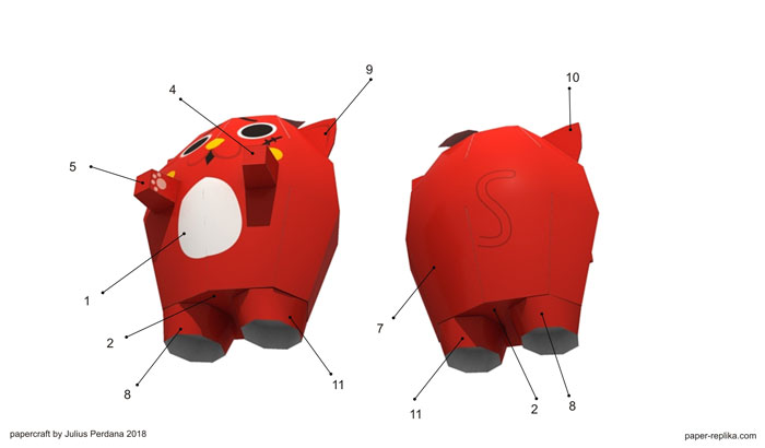 Combine part 1,2,3, and 7 first, as a base of all. Attach both legs (part 8 and 11), watch the seam's arrow on part 2. Glue each ears just like the picture above (9 and 10). Attach both hands (part 4 and 5) and finally finish it with a leave oh its head (part 6)